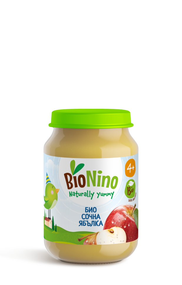 Фино смляна детска храна от ябълки за деца от 4-ия месец, освен ако педиатърът не препоръча друго. БЕЗ ГЛУТЕН, БЕЗ ДОБАВЕНИ КОНСЕРВАНТИ, БЕЗ ДОБАВЕНИ ЗАХАРИ, СЪДЪРЖА ЕСТВЕНИ ЗАХАРИ, 100% плодове