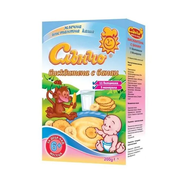 Тя е лесно смилаема и е подходяща за бебета и малки деца над 6 месеца. Слънчо Млечна каша бисквитена с банан с 11 витамина е засищаща, вкусна и балансирана. Съдържа ненаситени мастни киселини и микроелементи и аминокиселини, необходими за задоволяване на хранителните потребности на децата. Осигурява здравословно развитие и добре балансирана диета. Съставките са естествени, без добавени оцветители, консерванти и аромати.