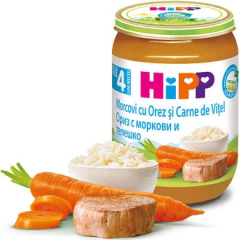 Hipp био пюре ориз, моркови и телешко 4М+ 190 гр е апетитна порция, която ще достави едно балансирано хранене на бебето след четвъртия месец.
