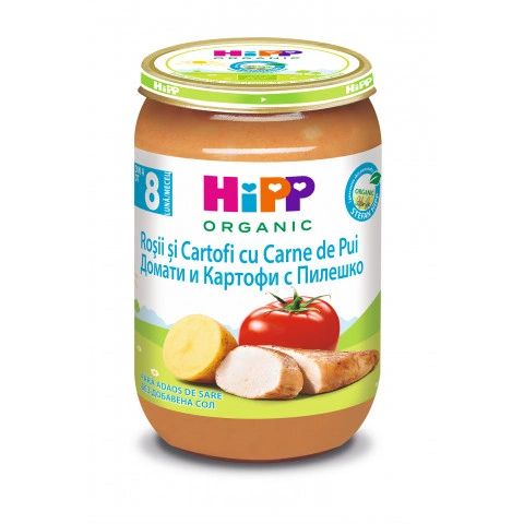 Hipp био пюре пиле с картофи и домати 8М+ 220 гр е продукт на марка HiPP, който може да давате на вашето дете при едно от дневните хранения.