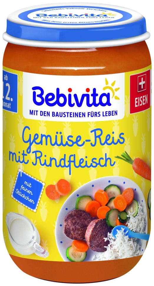 Био пюрето от зеленчуци, ориз и телешко месо на Bebivita е подходящо за бебета над 12 месеца.