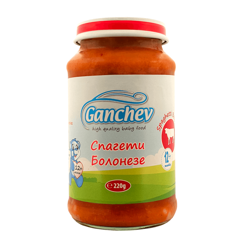 Ганчев Пюре спагети болонезе 12М+ 190 гр е с приятен вкус, а съдържащите се в него съставки доставят необходимите витамини, минерали и хранителни вещества, нужни за пълноценното развитие и растеж на бебето, както и обогатяват вкусовете на бебето и изграждат полезни хранителни навици. Без оцветители. Без стабилизатори. Без консерванти.