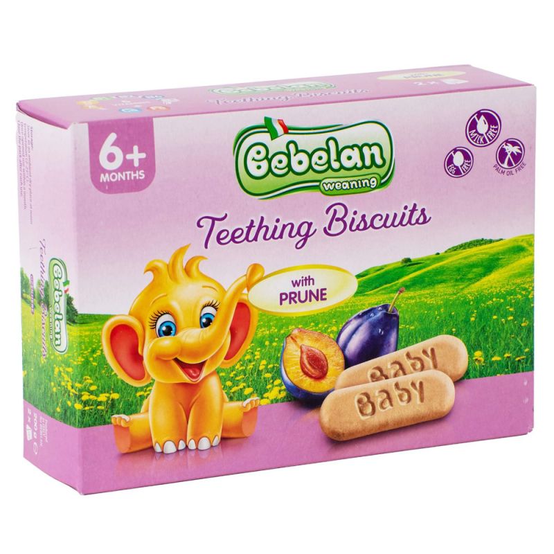 Те са обогатени с ценни витамини и микроелементи, а плодът синя слива има благоприятен ефект върху перисталтиката на децата. Подходящи както за закуска, така и за малка закуска между основните хранения по време на пътуване, разходка или след игри. Бебелан бисквити за гризкане със слива имат висока хранителна стойност и приятен за децата вкус. Не съдържат яйца, мляко и палмова мазнина.