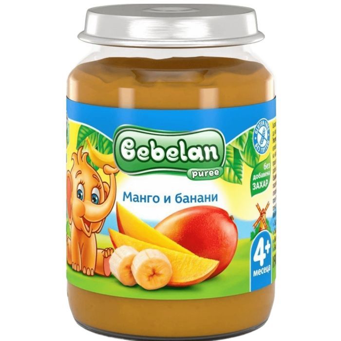 Bebelan Манго и банани Пюре 4М+ 190 гр е натурално пастьоризирано плодово пюре, предназначено за бебета след четиримесечна възраст.