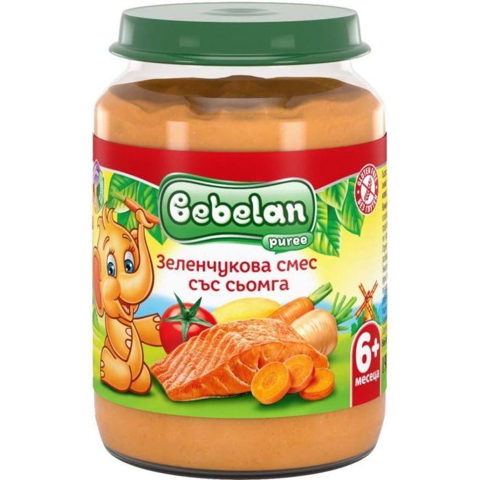 Bebelan Зеленчукова смес със сьомга 6М+ е стерилизиран хранителен продукт, предназначен за деца от 6-месечна възраст.