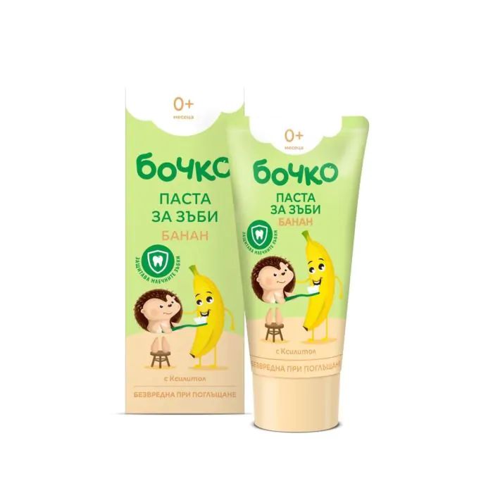 Формулата, с ниска абразивност, щади зъбките на бебето още от появата им. Ксилитолът, възпрепятства развитието на бактериите, причиняващи кариес, предпазва венците от възпаление, заздравява емайла и намалява плаката. Бочко Паста за зъби банан със защитно действие 0+ 150 мл е безвредна при поглъщане, защото не съдържа флуор, консерванти и оцветители. Има приятен плодов аромат и е подходяща за приучаване на бебето към устна хигиена още от най-ранна възраст. Може да се ползва съвместно с хомеопатични продукти.