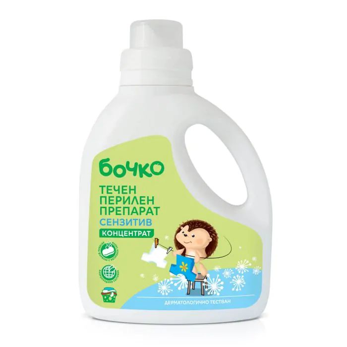 Бочко Сензитив перилен препарат има отлично изпиращо действие и ефикасно отстранява упоритите петна от бебешките и детски дрешки. Изключително грижовен към нежната и чувствителна кожа на бебето. Препаратът Бочко съдържа 100% разтворими активни съставки, които не остават в бебешките дрешки след изпиране и изплакване. Без оцветители и фосфати. С отличен изпиращ ефект дори при 30°C. Хипоалергенен.