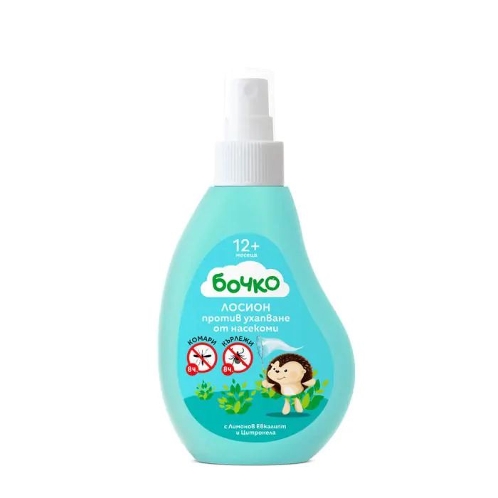 Бочко Лосион против ухапване от насекоми има нова, два пъти по-активна формула. Съдържа масло от евкалипт цитрудора, добито от сушени или пресни листа на растението, посредством процес на парна дестилация. Маслото е известно със свойството си да отблъсква кръвосмучещите насекоми. Така детето ви ще може да играе на воля, да спи или да се разхожда, без да става жертва на неприятните насекоми. Само с едно напръскване ще му осигурите нужното спокойствие. Освен срещу комари, лосионът е ефективен и срещу кърлежи. Осигурява нужната превенция, за да е спокойно и защитено детето ви. Подходящ е за деца над 1 годинка. Да не се прилага при деца под тази възраст, тъй като може да причини кожни раздразнения при по-малките. В голяма, икономична опаковка.