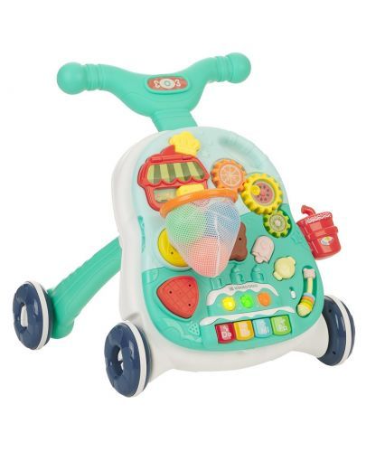 • Допринася за развитието на кординацията, подпомага здравия и безопасен растеж на бебето; 2в1 играчка, която се трансформира в играчка за прохождане и маса за игра;
