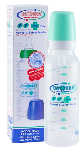 Camera бебешко шише е предназначено за безопасно и удобно хранене на бебета с мляко или хранителни течности. То е подходящо както за кърма, така и за изкуствено хранене.Камера бебешко шише притежава прозрачен силиконов биберон с голяма разтегливост.