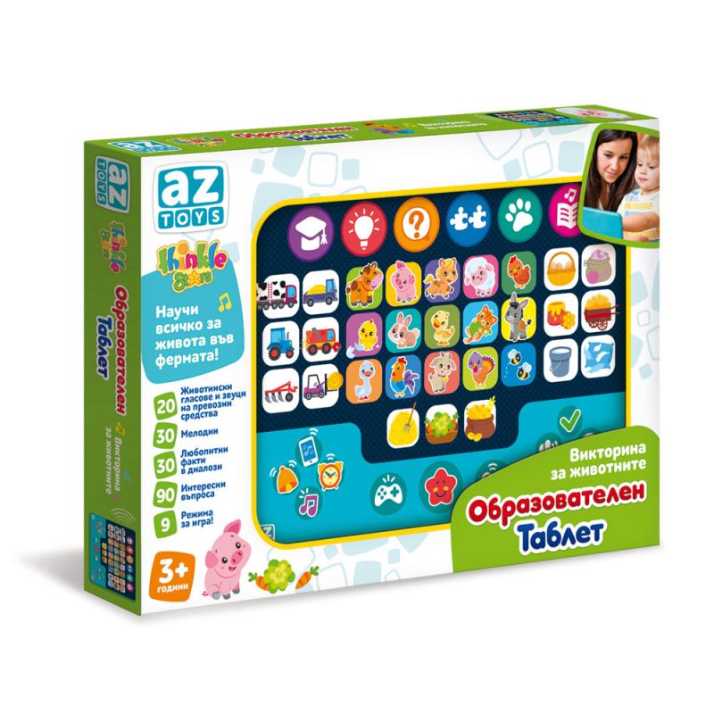 Thinkle Stars интерактивен таблет ''Викторина на животните''превръща ученето за животните в забавно и вълнуващо приключение.С помощта на занимателни въпроси, звуци и илюстрации, децата ще научат кои животни живеят във фермата, какви звуци издават и с какво са полезни. Викторините развиват паметта, концентрацията и логическото мислене, докато детето играе и се забавлява.Цветният дизайн, удобните бутони и ясните звукови ефекти правят таблета подходящ както за самостоятелна игра, така и за споделено време с родител.
