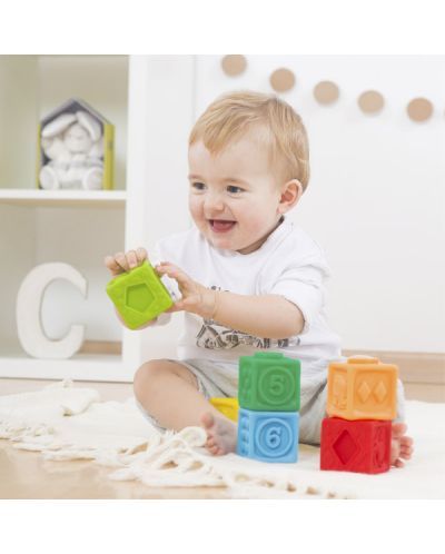Меки гумени бебешки кубчета са изработени от мек и безопасен материал, който позволява на бебето спокойно да ги стиска, подрежда и изследва. Благодарение на ярките цветове, различните форми и релефни повърхности, кубчетата стимулират сетивното развитие и насърчават ранното обучение чрез игра.Играчката е подходяща още от ранна възраст, когато детето започва да развива координацията между ръцете и очите. Малките ръчички лесно могат да хващат и подреждат кубчетата, което подпомага развитието на фината моторика и пространственото мислене. Меката текстура ги прави безопасни и удобни дори когато бебето ги поставя в устата по време на никненето на зъбки.Кубчетата могат да се използват както за свободна игра, така и за изграждане на първи конструкции и изучаване на цветове, числа, животни или форми. Освен това много модели могат да се използват и като играчки за баня, тъй като са леки, устойчиви и лесни за почистване.